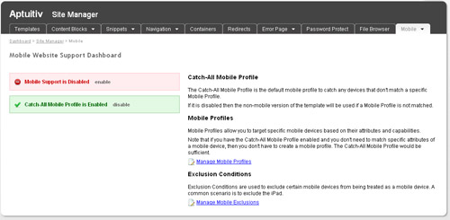 You can also take it one step further and create Mobile Profiles to display content to specific mobile devices. For example you can create a profile to match iPhones and then use the Catch-All Mobile Profile to display content to all other mobile devices.