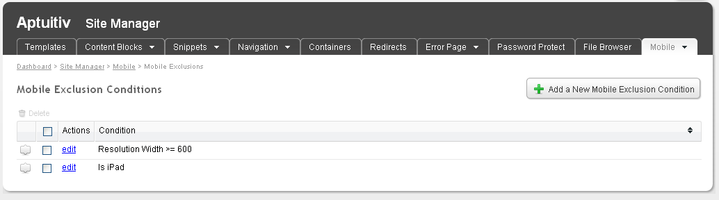 The Exclusion Condition list is used to exclude certain mobile devices from being treated as a mobile device. If a mobile device matches one of the Exclusion Conditions then it is treated as a desktop browser and the regular site template will be used.