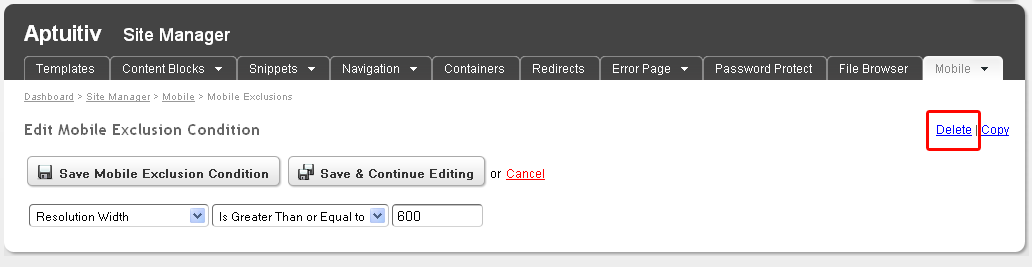 You can also delete an individual condition while on the Edit Mobile Exclusion Condition page. Simply click the Delete link in the upper right. You will be prompted to confirm that you want to delete the condition.