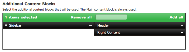 A list of content blocks that you've created can be seen at the bottom of the General Information tab. To make a content block available for a template to use, click and drag the block from the right side of the blocks menu to the left side.