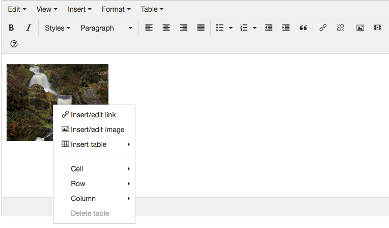 To insert an image in the editor, put your cursor where you want the image placed and click the Insert/edit image button. Or select the Insert/edit image button under the Insert tab. You may also right click to access the button.